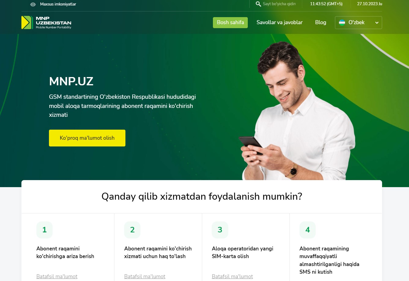 Actuellement, 5 opérateurs mobiles opèrent en Ouzbékistan tels que Beeline, Mobi.uz, Ucell, UZTELECOM, Humans. Ils fournissent des services de communication mobile aux clients. Si l'opérateur mobile est modifié à l'aide du service, les numéros transférés conserveront leur forme et leur apparence.