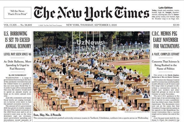 Издание сообщило, что в Узбекистане вступительные испытания под открытым небом пройдут для 1,4 миллиона абитуриентов. Десятки тысяч молодых людей по всей стране направились на стадионы держать экзамены, которые проходят на воздухе из-за пандемии коронавируса. Их ожидает трехчасовое тестирование, сидя за столами, расставленными на беговых дорожках спортивных арен. Они борются за 150 тысяч мест в университетах.