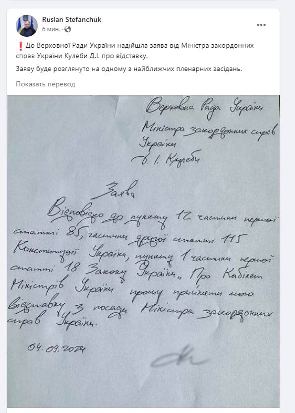 Спикер украинского парламента также разместил фотокопию заявления Кулебы, в котором он просит об отставке.