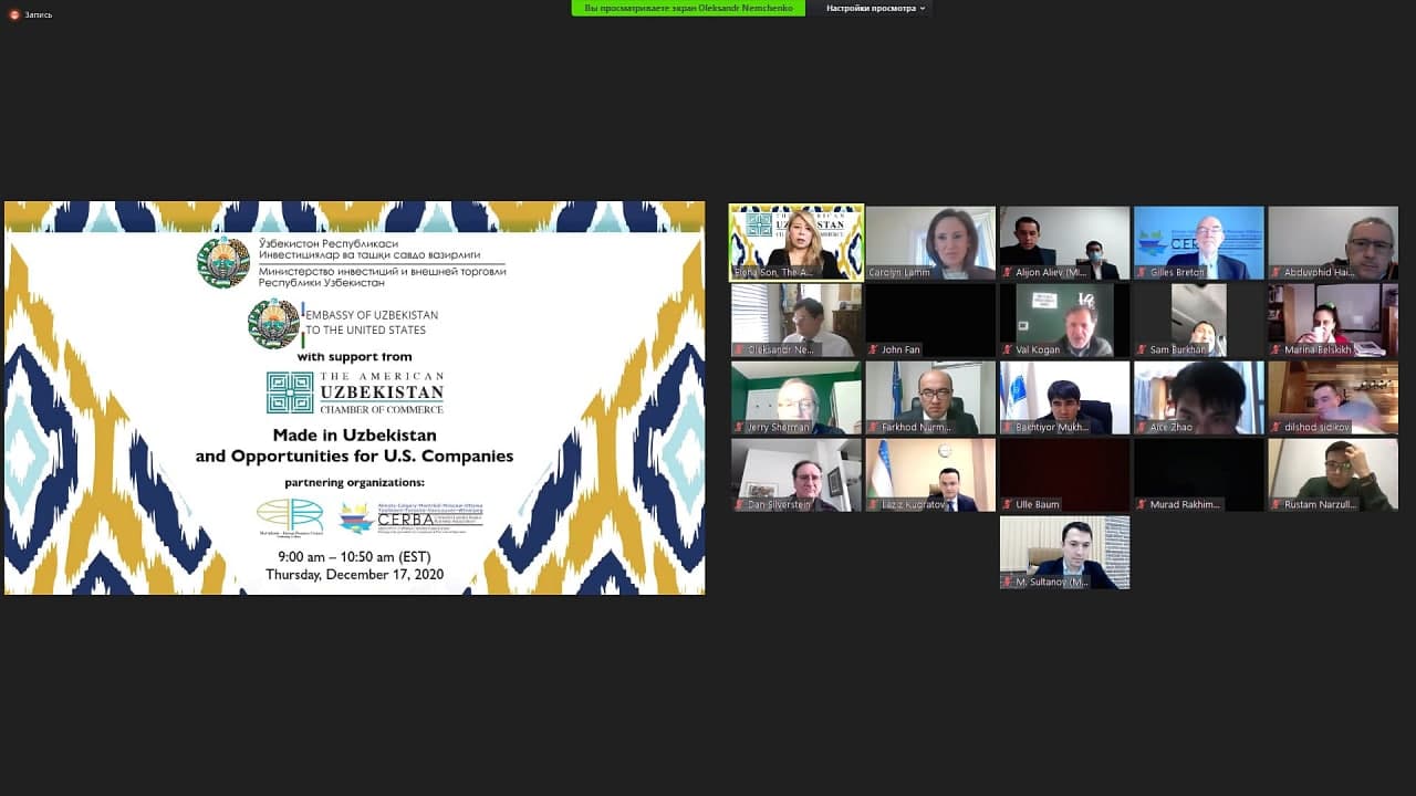 17 декабря текущего года в формате видеоконференции проведена виртуальная презентация национальной продукции «Made in Uzbekistan». Мероприятие было организовано в сотрудничестве с Американо-Узбекской торговой палатой и Национальным советом директоров Канадской деловой ассоциации в Евразии и России. В презентации приняли участие представители около 100 крупнейших компаний из США и Канады.