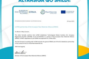 13:18 13.08.2025По информации Узбекского комбината технологических металлов (ТМК), в прошлом году Узбекистан подписал с Европейским Союзом меморандум о взаимопонимании в сфере критически важного сырья