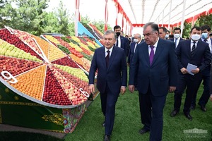 08:32 12.06.2021Президент Узбекистана Шавкат Мирзиёев и Президент Таджикистана Эмомали Рахмон посетили сад «Вахдати миллат» («Национальное единство») в Гафуровском районе Согдийской области