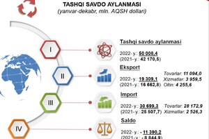 17:02 24 Yanvar 2023Statistika agentligi maʼlumotlariga koʻra, 2022-yilda hududlar kesimida tashqi savdo aylanmasi hajmi ochiqlandi.