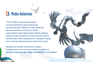 18:33 30 Avgust 2024“FIDO-BIZNES” kompaniyasi qadrli yurtdoshlarimizni hamda hamkorlar va hamkasblarni Oʻzbekiston Respublikasi Mustaqilligining 33 yilligi bilan muborakbod etadi!