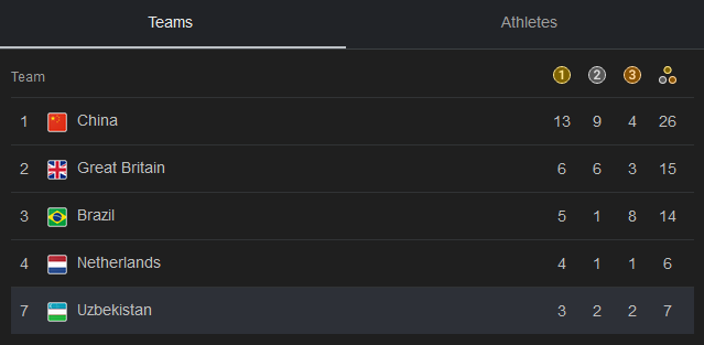 Bu orqali Oʻzbekiston delegatsiyasi medallari soni 7 ta (3 ta olti, 2 ta kumush va 2 ta bronza)ga yetdi va umumjamoa hisobida 7-oʻringa koʻtarilib oldi.