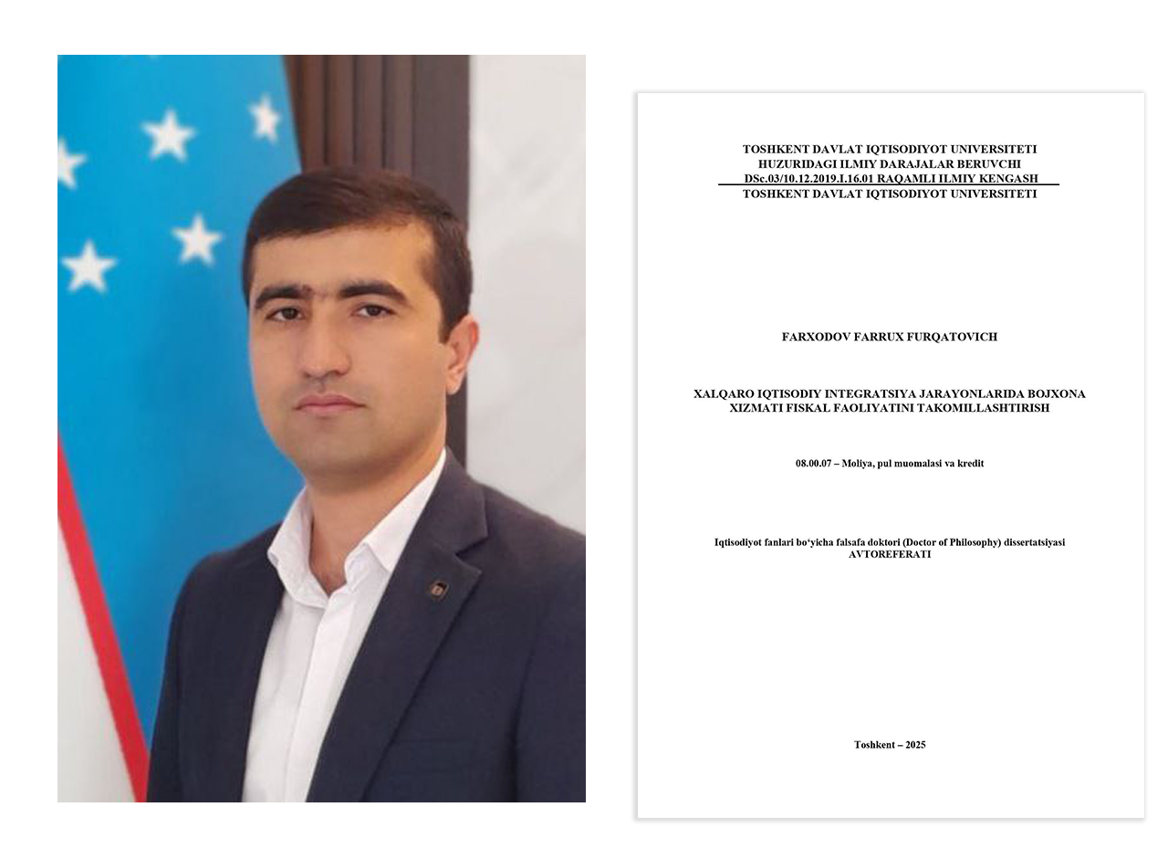Farxodov Farrux Furqatovichning 08.00.07 - Moliya, pul muomalasi va kredit ixtisosligi boʻуiсhа “Xalqaro iqtisodiy integratsiya jarayonlarida bojxona xizmati fiskal faoliyatini takomillashtirish” mavzusidagi iqtisodiyot fanlari boʻyicha falsafa doktori (PhD) ilmiy darajasini olish uchun yozilgan dissertasiya ishi himoyasi Toshkent davlat iqtisodiyot universiteti huzuridagi ilmiy darajalar beruvchi DSc.03/10.12.2019.I.16.01 raqamli Ilmiy kengashning 2026-yil 8-yanvar kuni soat 16:00 dagi majlisida boʻlib oʻtadi.