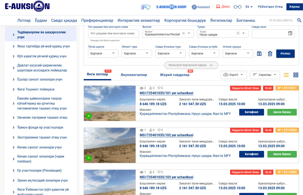 Bugungi kunda Qoraqalpogʻiston Respublikasini kompleks rivojlantirish, aholining farovon turmushini taʼminlash borasida koʻplab farmon va qarorlar qabul qilindi. Jumladan, tegishli farmonga binoan 2025-2027-yillarda Nukus shahrida qiymati kamida 500 ming AQSH dollar, Amudaryo, Nukus, Qoʻngʻirot va Xoʻjayli tumanlarida 300 ming AQSH dollar, tumanlarda 100 ming AQSH dollari ekvivalentidagi yirik investitsiya loyihalari uchun Vazirlar Kengashining qarori asosida yer uchastkalarini toʻgʻridan-toʻgʻri berishga ruxsat etildi. Bu asosan yirik tadbirkorlar, xorijiy investorlar uchun qoʻshimcha qulaylik va imtiyozlar beradi. Ishni kichikroq tadbirkorlikdan boshlamoqchi boʻlganlar “E-auksion” platformasidagi kommunikatsiya mavjud joyni sotib olib, oʻz biznesini yoʻlga qoʻyishiga ishonamiz. Shunda tadbirkorlar safi kengayib, ular uchun qoʻshimcha imkoniyat yaratiladi. Hududlardagi kambagʻallikni qisqarishiga ushbu tashkilot ham maʼlum miqdorda oʻz hissasini qoʻshadi.