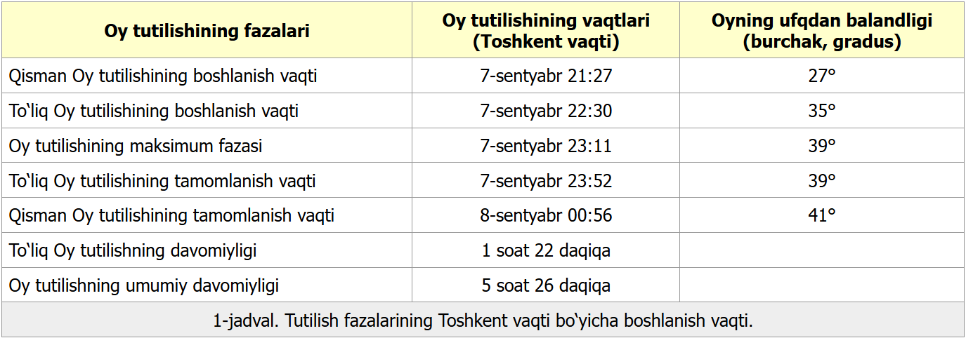 7-sentyabr kuni Oʻzbekiston aholisi va qator boshqa mamlakatlar fuqarolari noyob astronomik hodisaga — toʻliq oy tutilishiga guvoh boʻladi. Bu holat odatda “Qonli Oy” deb ham yuritiladi. Shu paytda Yer yoʻldoshi qizgʻish tusga kiradi.