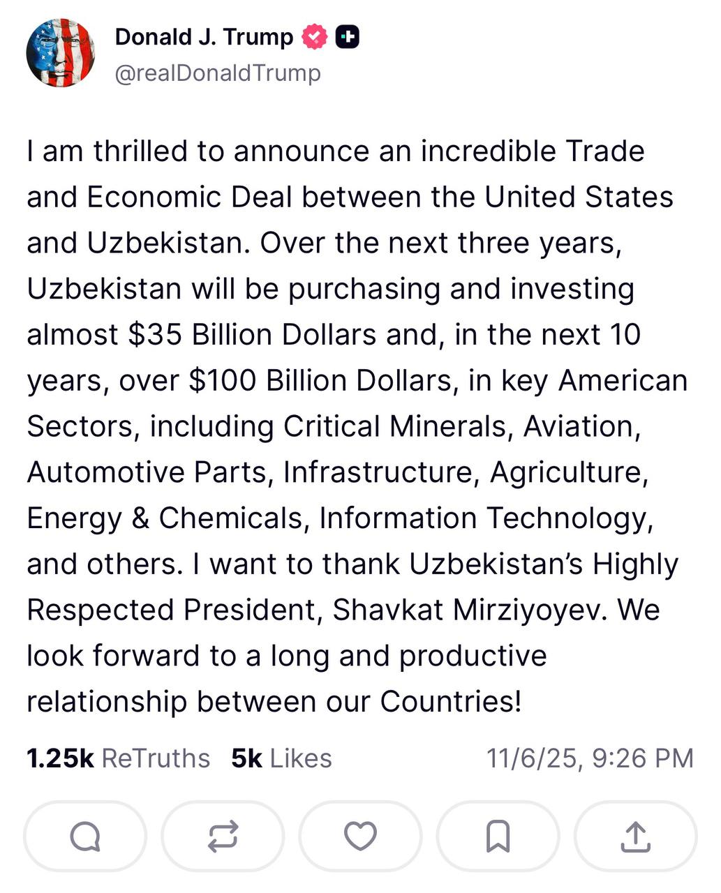 “Amerika Qoʻshma Shtatlari va Oʻzbekiston oʻrtasidagi misli koʻrilmagan savdo-iqtisodiy kelishuvni eʼlon qilishdan mamnunman. Yaqin uch yil ichida Oʻzbekiston Amerikaning muhim minerallar, aviatsiya, avtomobil butlovchi qismlari, infratuzilma, qishloq xoʻjaligi, energetika va kimyo, axborot texnologiyalari va boshqa muhim tarmoqlariga qariyb 35 milliard dollar, kelgusi oʻn yilda esa 100 milliard dollardan ortiq investitsiya kiritadi va xaridlarni amalga oshiradi”, deb yozadi Tramp.