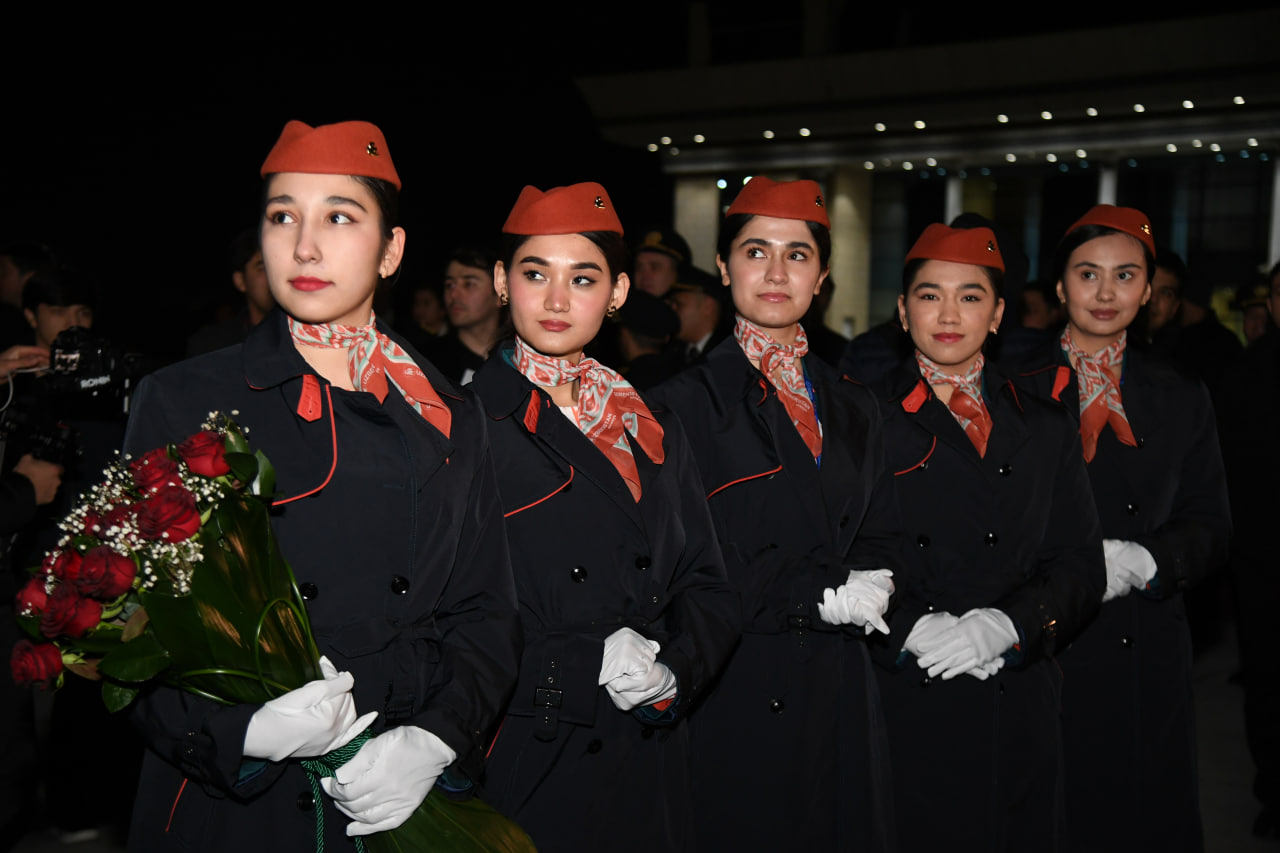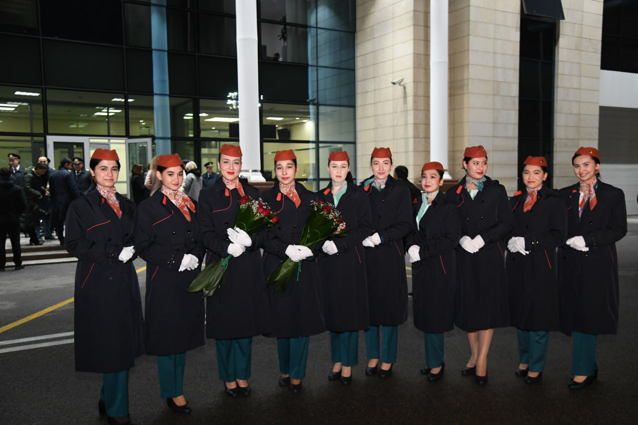 Toshkent shahar aeroportida aviatsiya an’analariga muvofiq havo kemasi tantanali ravishda suv arkasi bilan kutib olindi.