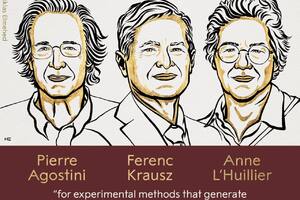 23:28 04.10.2023Mukofot Peru Agostini, Ferensu Krausu va Ann LʻYuilega materiyadagi elektronlarning dinamikasini oʻrganish uchun yorugʻlikning attosoniyali impulslarini hosil qiluvchi eksperimental usullar uchun topshirildi.