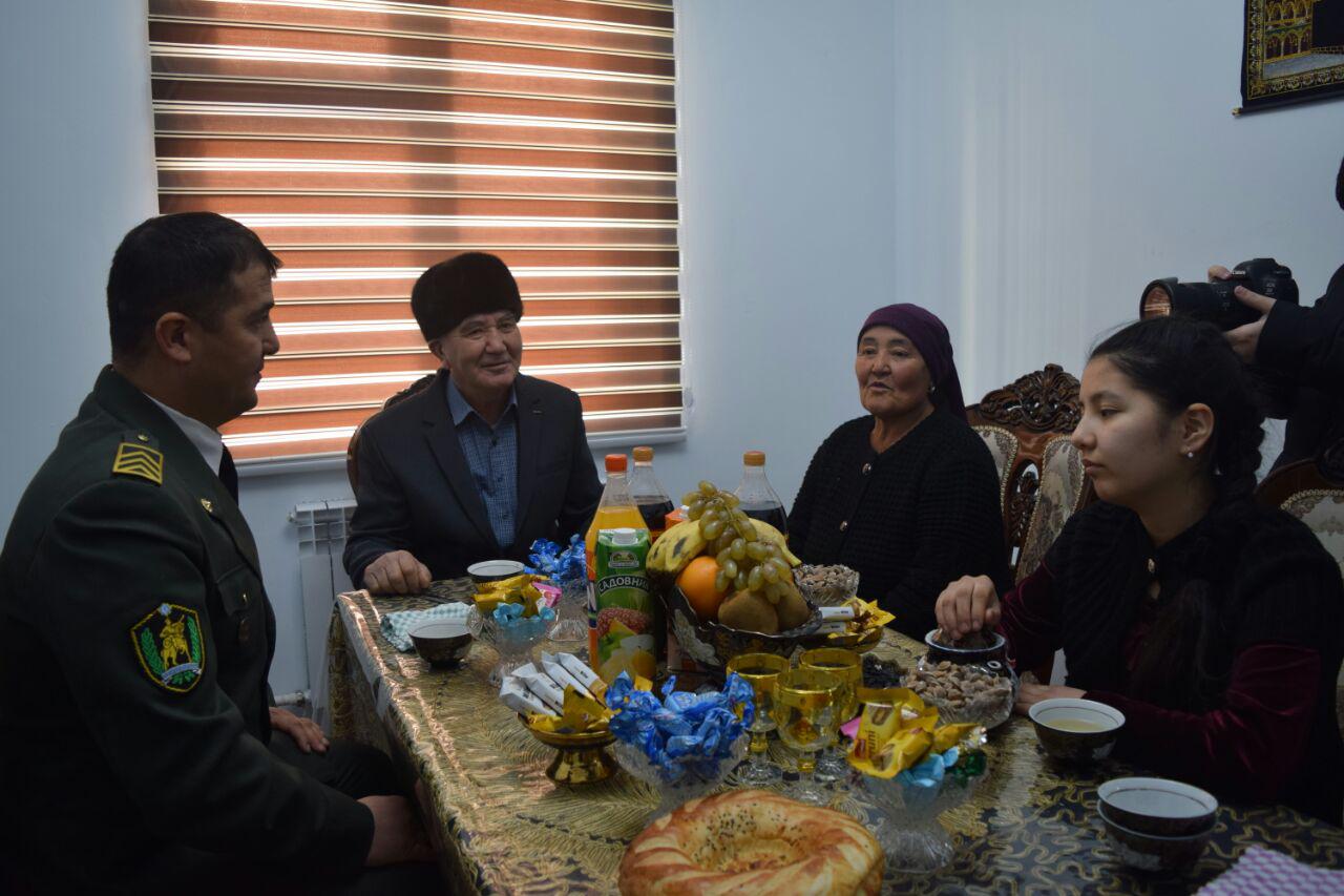 Меҳмонқули ака билан сержант Хушвақт Яхшиевнинг янги икки хонали уйида суҳбатлашдик. Хушвақт Наманган вилоятининг Поп туманида хизмат бурчини ўтаяпти. 20 йилдирки, Ватан ҳимоячилари сафида. Уч фарзанди бор. Оиласи уй-жойга эҳтиёж сезаётган эди. Орзуси ушалди. Энди кўнгли хотиржам.