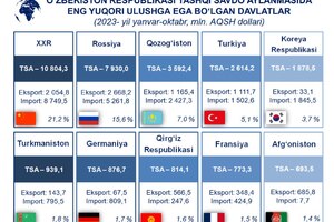 10:44 23 Ноябрь 2023Статистика агентлиги маълумотларига кўра, 2023 йилнинг январь-октябрь ойларида Ўзбекистон Республикасининг ташқи савдо айланмаси 51 млрд АҚШ долларига етган.