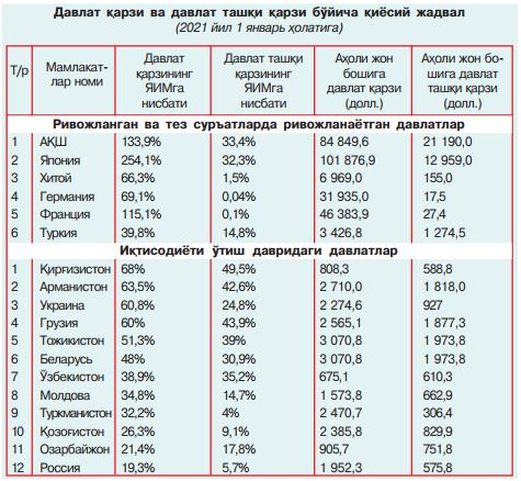 Мана шундай шароитда Ўзбекистон учун ташқи қарз манбалари билан биргаликда ички манбаларни кўпроқ йўналтиришнинг замонавий механизмларини кўзда тутувчи ички қарз бозорини ривожлантириш, бизга қарз берувчи мамлакатлар бўйича қарз таркибини миллий манфаатларимиздан келиб чиққан ҳолда диверсификациялаштириш, давлат қарзини бошқариш бўйича ишлаб чиқиладиган стратегиянинг асосий масалалари сифатида қаралиши лозим. Чунки давлат қарзи, айниқса, ташқи қарз хавф-хатарлар билан боғлиқлиги бу, бор ҳақиқат.