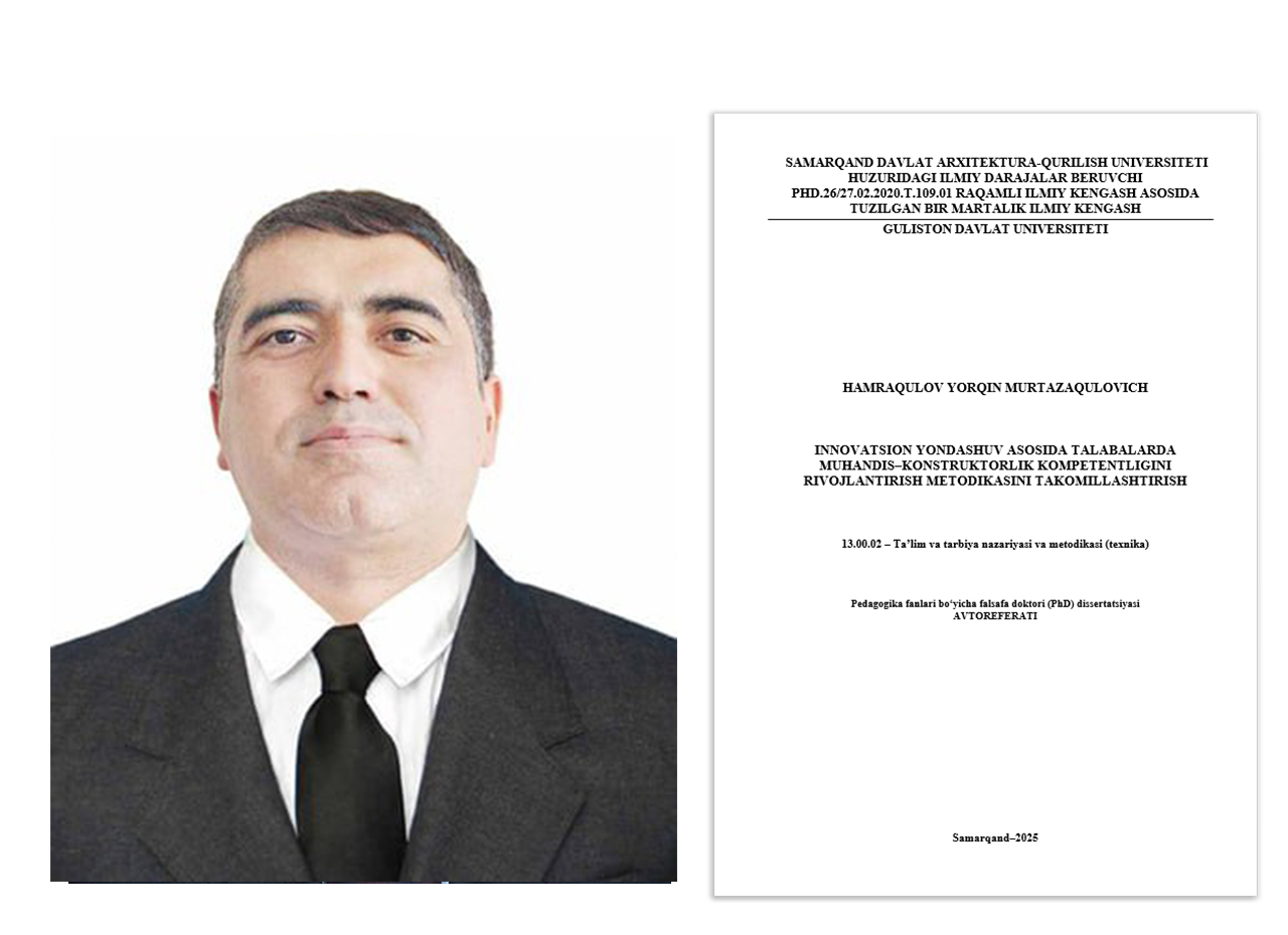 Ҳамрақулов Ёрқин Муртазақуловичнинг 13.00.02 – Таълим ва тарбия назарияси ва методикаси (техника фанлари) ихтисослиги бўйича “Инноватцион ёндошув асосида талабаларда муҳандис—конструкторлик компетентлигини ривожлантириш методикасини такомиллаштириш” мавзусидаги (педагогика фанлари бўйича) фалсафа доктори (PhD) диссертациясининг ҳимояси Самарқанд давлат университети ҳузуридаги илмий даражалар берувчи PhD.26/27.02.2020.T.109.01 рақамли илмий кенгашнинг 2025 йил 31 октябрь куни соат 10:00 даги мажлисида бўлиб ўтади.
