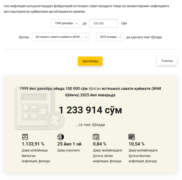 Ушбу калькулятор билан 1999 йил декабрдан 2025 йилнинг январь ойигача бўлган даврдаги инфляция кўрсаткичини ҳисоблаш мумкин. Жумладан, 1999 йилнинг декабрь ойидаги 100 минг сўм пул маблағи 2025 йилнинг январь ойидаги 1 миллион 233 минг сўмга тўғри келади.