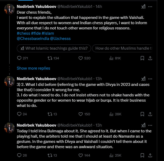 «Ҳурматли шахматчилар, Ваишали билан ўйинда бўлган вазиятни тушунтирмоқчиман. Аёллар ва ҳиндистонлик шахматчиларни ҳурмат қилган ҳолда, диний сабабларга кўра бошқа аёлларга тегмаслигимни ҳаммага билдирмоқчиман», — деб ёзади Якуббоев ўзининг Х тармоғидаги саҳифасида.