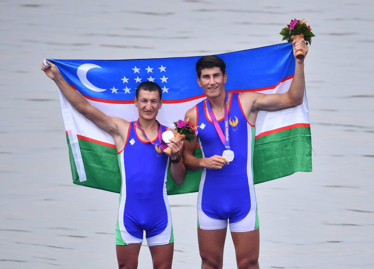 Ўзбекистон делегацияси ХIХ ёзги Осиё ўйинларида дастлабки медалларини қўлга киритди. “Почин” академик эшкак эшиш бўйича аёллар ўртасида енгил вазн тоифасидаги жуфтлик дастурида иштирок этган Луизахон Исломова ҳамда Малика Тагматова ҳисобига ёзилди. Ҳамюртларимиз муросасиз кечган финал дастурида марра чизиғини иккинчи бўлиб кесиб ўтишди ва кумуш медалини қўлга киритишди. Академик эшкак эшиш бўйича эркаклар ўртасида енгил вазнли спортчилар баҳсида Шаҳзод Нурматов ҳамда Собиржон Сафаралиев бронза медалига сазовор бўлди. Шунингдек М2х дастурида иштирок этган Шаҳбоз Холмирзаев ҳамда Меҳрожбек Маматқулов жуфтлиги кумуш медалини қўлга киритди. Мазкур стартда олтин медал Хитой, бронза медали эса Индонезияга насиб этди.