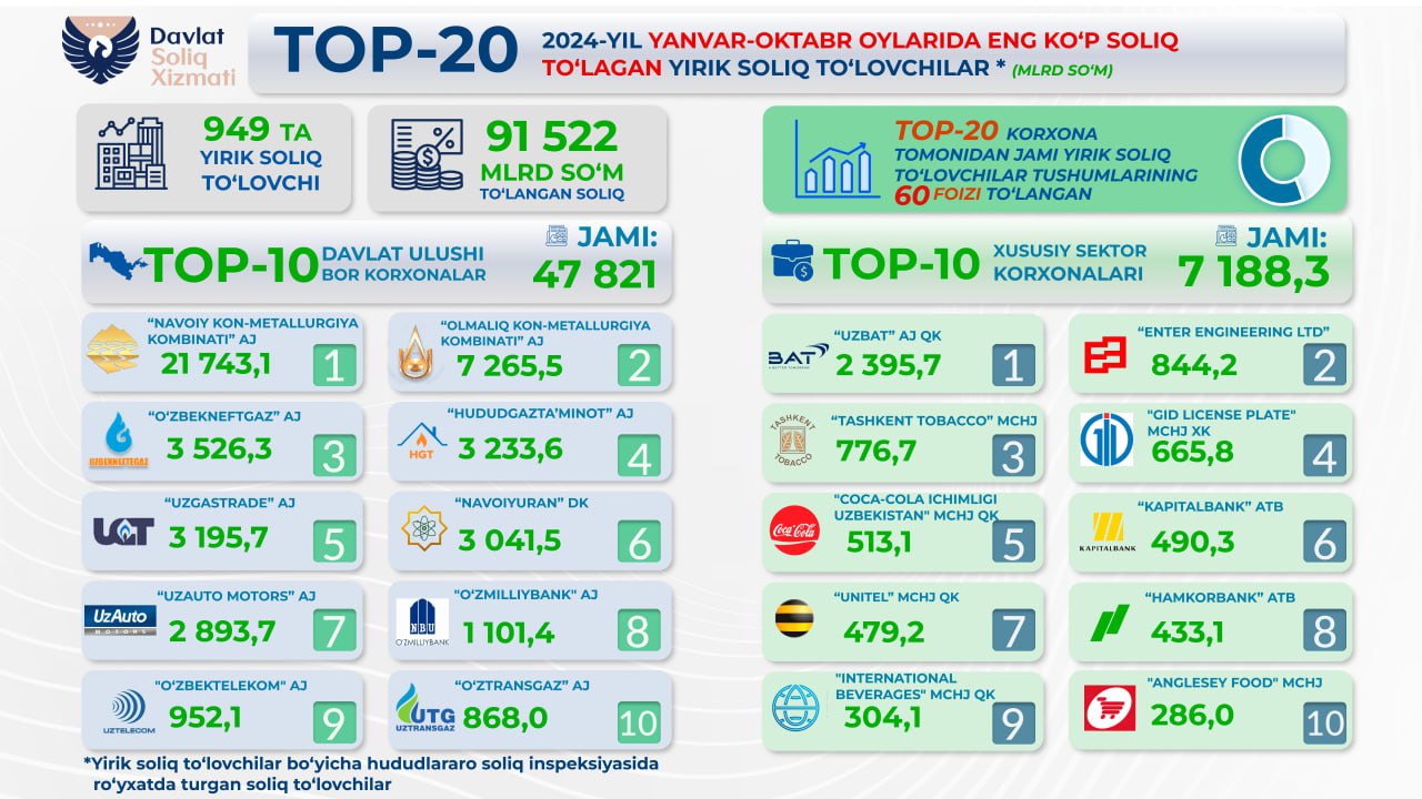 2024 йилнинг январ-октабр ойларида Ўзбекистонда 949 та йирик солиқ тўловчилар томонидан 91,5 триллион сўмдан ортиқ солиқ тўланди. Бу солиқ тушумларининг катта қисми давлат улуши мавжуд ва хусусий сектордаги етакчи корхоналар ҳиссасига тўғри келади. Бу ҳақда «Фискал таҳлиллар» портал хабар берди.