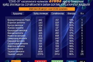 08:38 21 Август 2020Из 37 693 пациентов, которым в настоящее время поставлен диагноз, выздоровели 33 442 человека - 88%