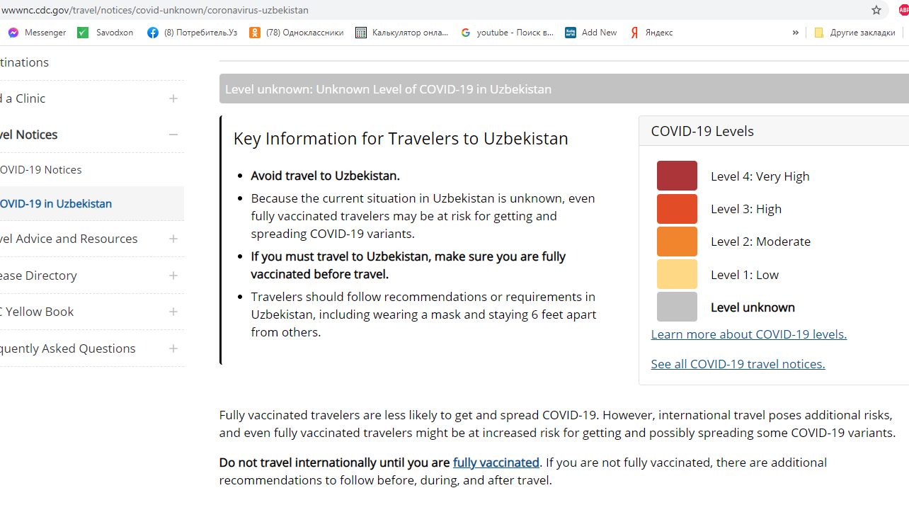 Центр по контролю и профилактике заболеваний при Министерстве здравоохранения США включил Узбекистан в список стран, где риск заражения коронавирусом неизвестен.