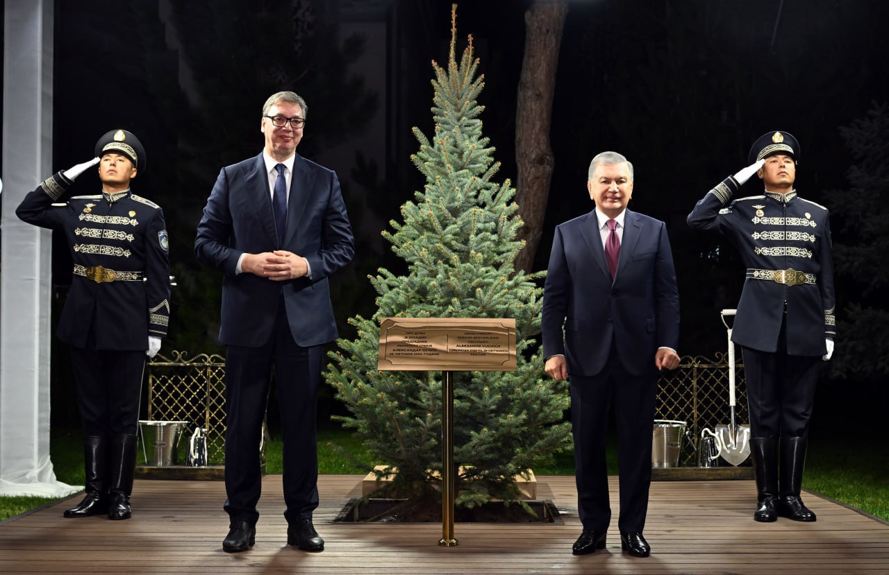 На Аллее почетных гостей Президенты Шавкат Мирзиёев и Александр Вучич посадили дерево в знак приверженности укреплению отношений дружбы и партнерства между двумя странами и народами, обоюдного стремления открыть новую страницу в истории двусторонних отношений.