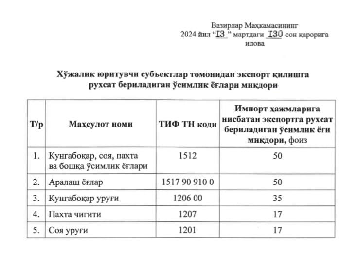 Vazirlar Mahkamasi qarori bilan xoʻjalik yurituvchi subyektlarga ularning tashkiliy-huquqiy shaklidan qatʼi nazar, oʻzlari import qilgan oʻsimlik yogʻlari hamda moyli ekinlar (paxta, kungaboqar va soya) urugʻlarini qayta ishlashdan olingan oʻsimlik yogʻlarini yuqorida belgilangan miqdorlarda eksport qilishga ruxsat berilmoqda.