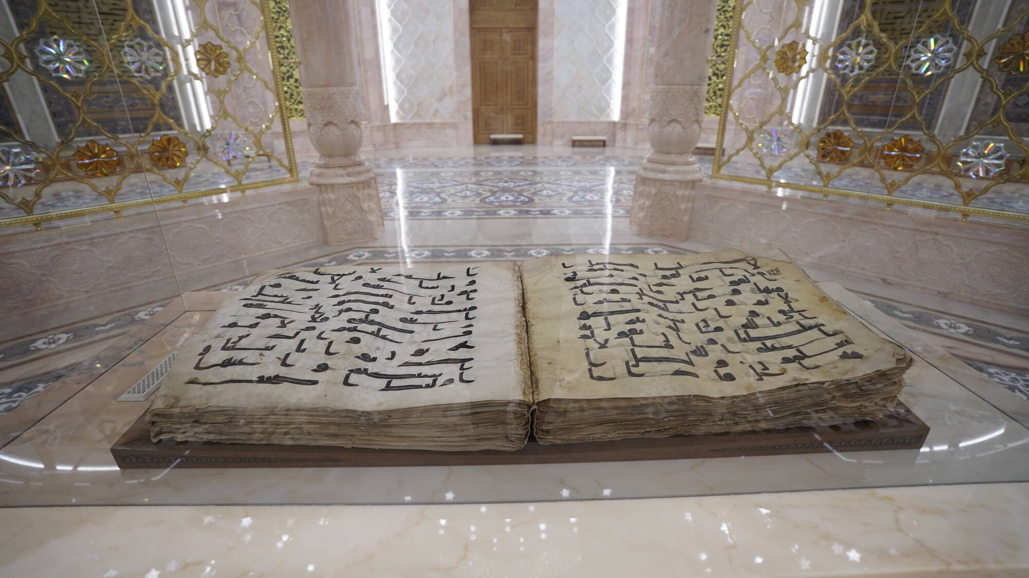 – Bu yerda namoyish etilayotgan musʼhaf – islom tarixidagi eng qadimiy va eng ishonchli qoʻlyozmalardan biri. Milodiy 644-656-yillar oraligʻida musulmon ummatiga rahbarlik qilgan Xalifa Usmon (r.a.) tomonidan yozdirilgan, oʻzlari ham muntazam oʻqib yurgan muborak Qurʼon nusxasi hisoblanadi.