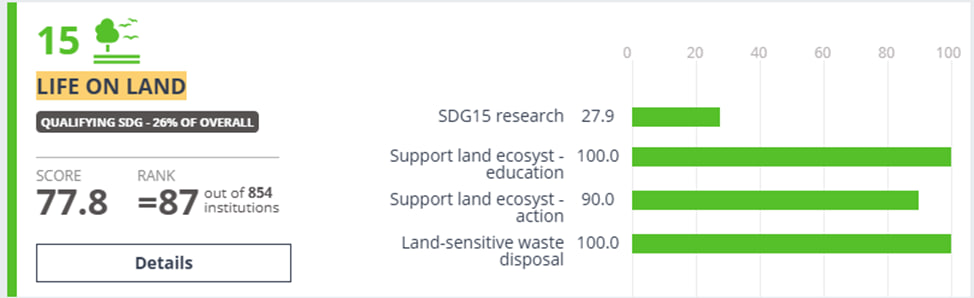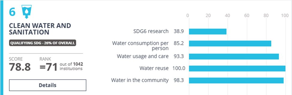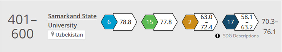Samarqand davlat universiteti, shuningdek, Toza suv va sanitariya (SDG6) va Quruqlikdagi ekotizimlarni asrash (SDG15) yoʻnalishlarida dunyoning TOP-100 universitetlari roʻyxatiga ham kiritildi.