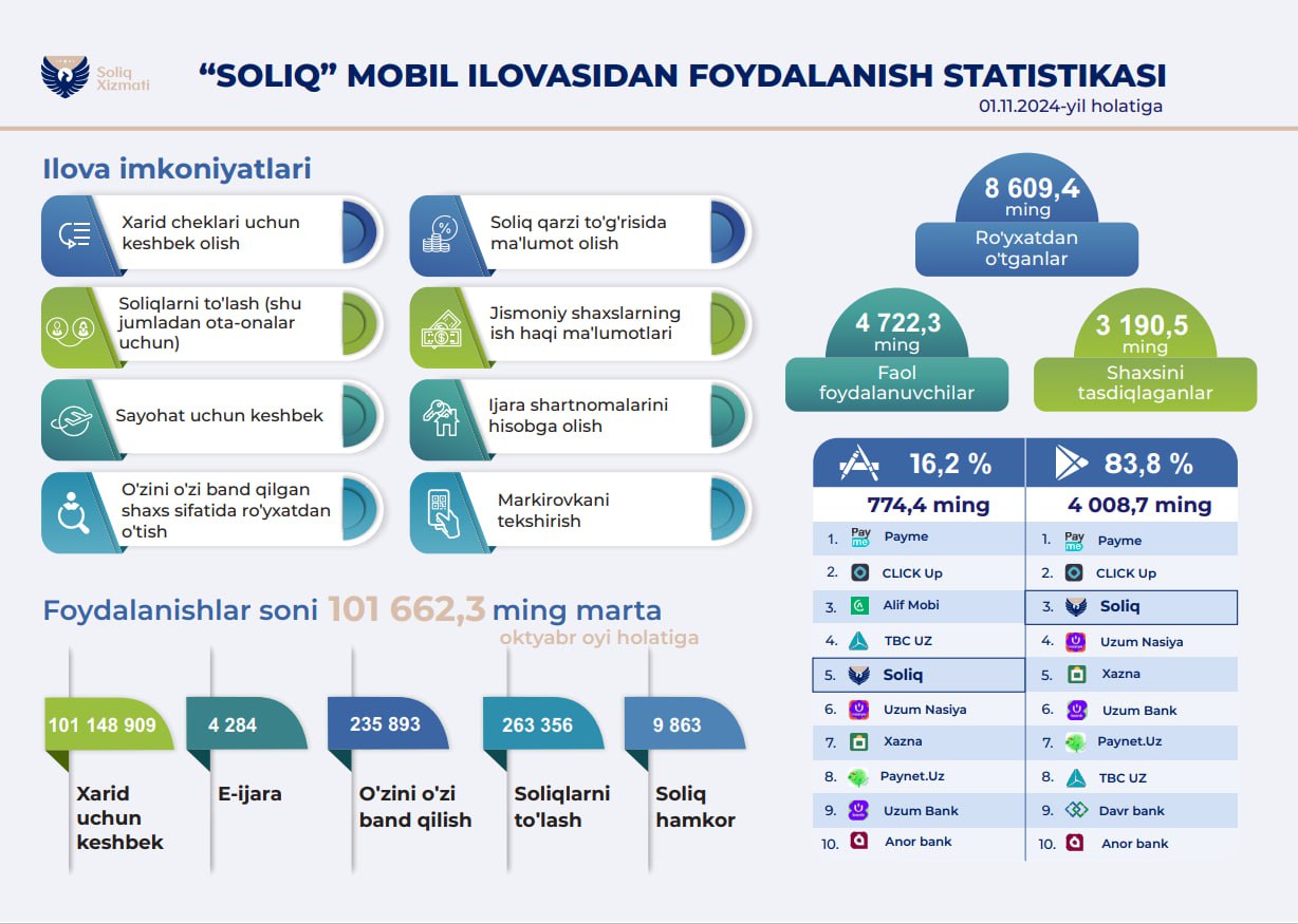 Soliq mobil ilovasi foydalanuvchilar soni oydan-oyga ortib bormoqda. 2024-yil 1-noyabr holatiga ilovada roʻyxatdan oʻtganlar soni 8,6 milliondan oshgan.