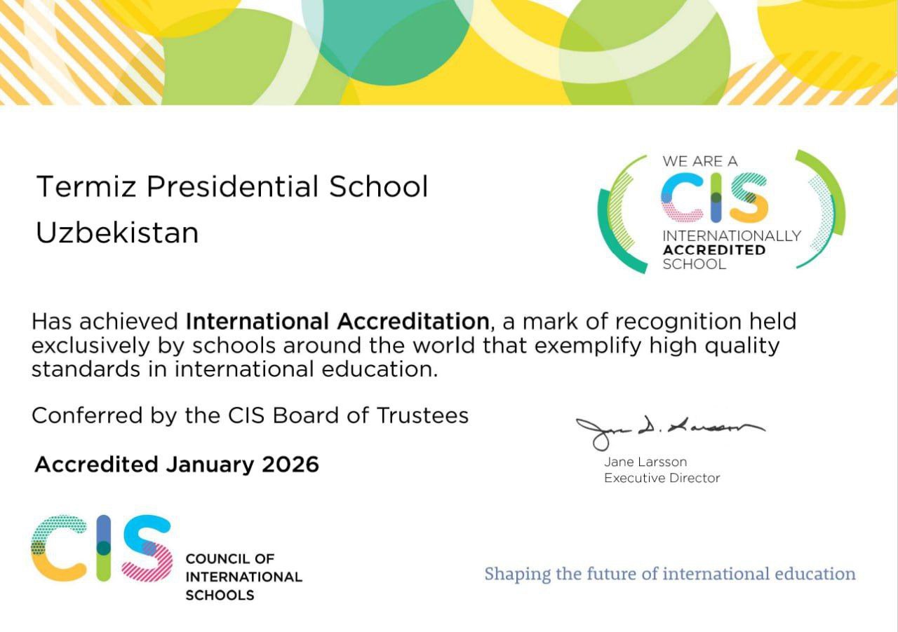 Termiz shahridagi Prezident maktabi nufuzli Xalqaro maktablar kengashi (CIS) aʼzoligiga qabul qilindi. Ushbu xalqaro eʼtirof taʼlim muassasasida oʻquv jarayonlari jahon taʼlim standartlariga toʻliq mos ekanini tasdiqlaydi.