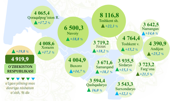 Навоий (6,5 миллион сўм), Тошкент (4,7 миллион сўм), Андижон (4,3 миллион сўм) вилоятлари ва Қорақалпоғистонда (4 миллион сўм) ҳам яхши натижалар қайд этилди.