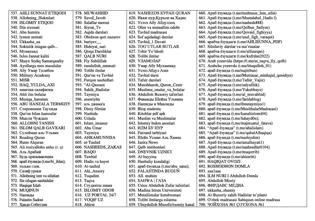 2026 йил 10 январь ҳолатига кўра, ҳуқуқ-тартибот идоралари мурожаатига асосан Дин ишлари бўйича қўмита томонидан тайёрланган диншунослик экспертизаси хулосаси асосида қарийб 1 минг 600 та контент радикал мазмунда деб топилган ва уларни Ўзбекистон ҳудудига олиб кириш, тайёрлаш, тарқатиш ва намойиш этиш тўлиқ тақиқланган.