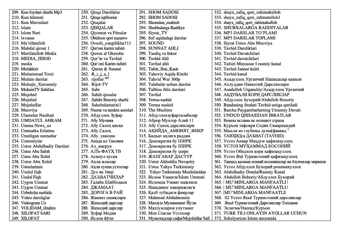 - Odnoklassnikiʼда — 36 та, шунингдек, интернет жаҳон ахборот тармоғидаги сайтлар ҳамда бошқа манбаларда 33 та контент тақиқланган.