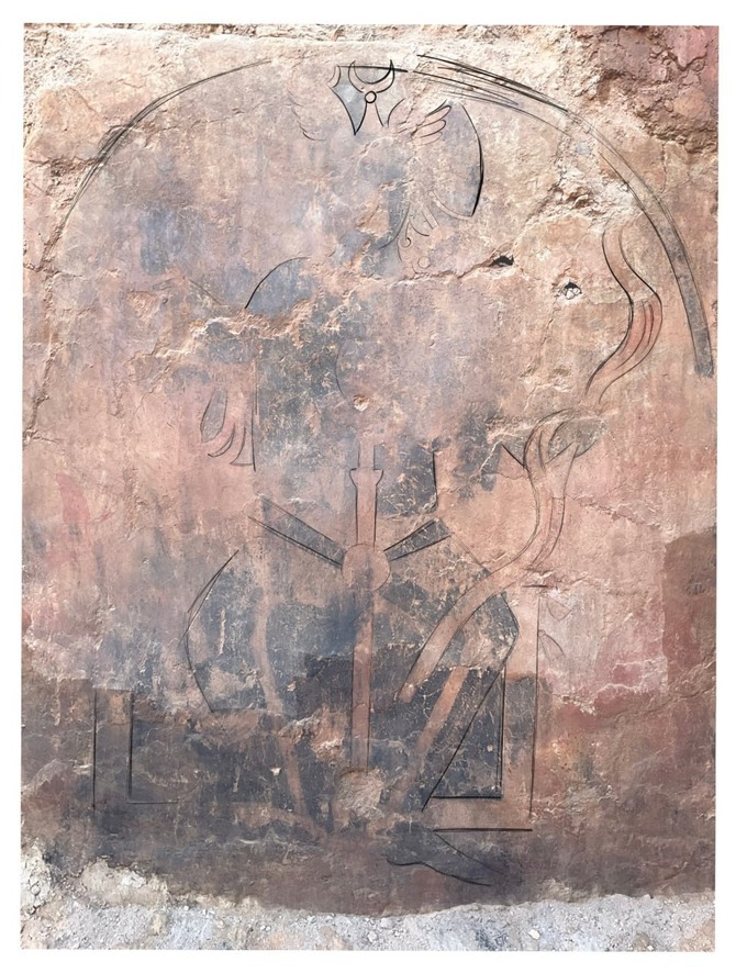 Шунингдек, хона деворлари диний мавзудаги суратлар билан безатилган бўлиб, сақланиб қолинган тасвирлар орасида юзи овалсимон, қулоқ ва қўллари эса зебу-зийнатларга бой бўлган маъбуданинг тасвири мавжуд. Унинг бошида илк ўрта асрлар Сўғд санъатида кўп учрайдиган қанотли, устки қуббаси ярим ой шаклда бўлган тож тасвири акс эттирилган.